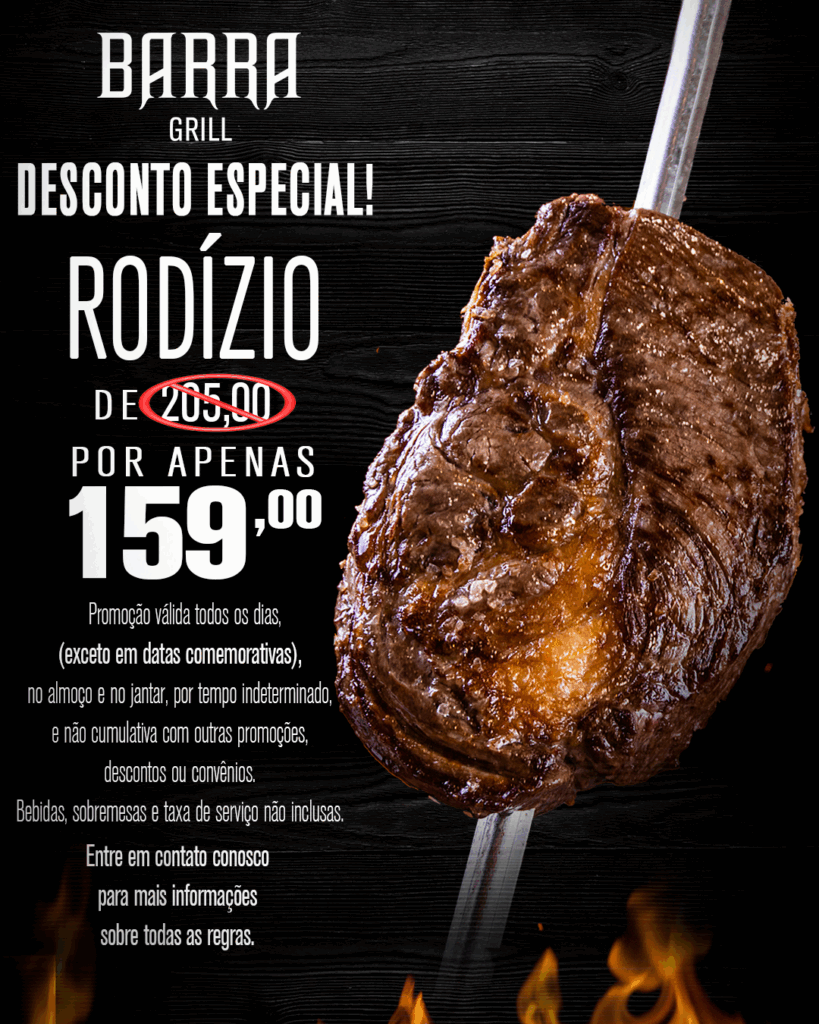 20% de desconto no valor do rodízio. Bebidas, sobremesas e taxa de serviço não estão incluídos na promoção. O cliente deverá apresentar a carteirinha e um documento com foto.